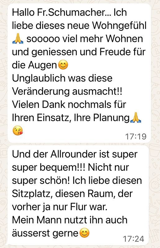 Liebe Frau Schumacher, wir sind so happy. Der Schreiner war da, super kompetent und so nett und sympathisch. Sind total begeistert von den neuen Möbeln. Sie haben uns, wie immer, perfekt beraten! Danke für Ihre Hilfe 👍👍👍🍀🍀